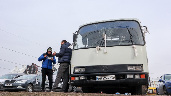 Розбиті вікна, перебите лобове скло, сліди від обстрілів і "прильотів" на боках. Саме на такому транспорті мешканців Бучі вивезли Сергій і Дмитро.