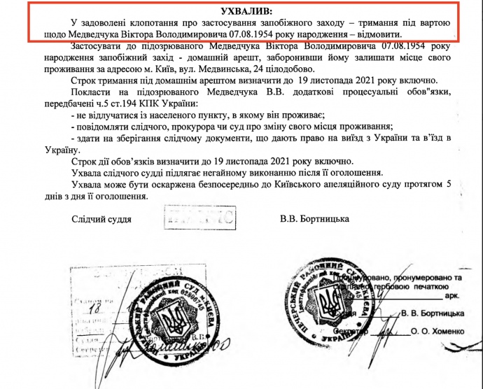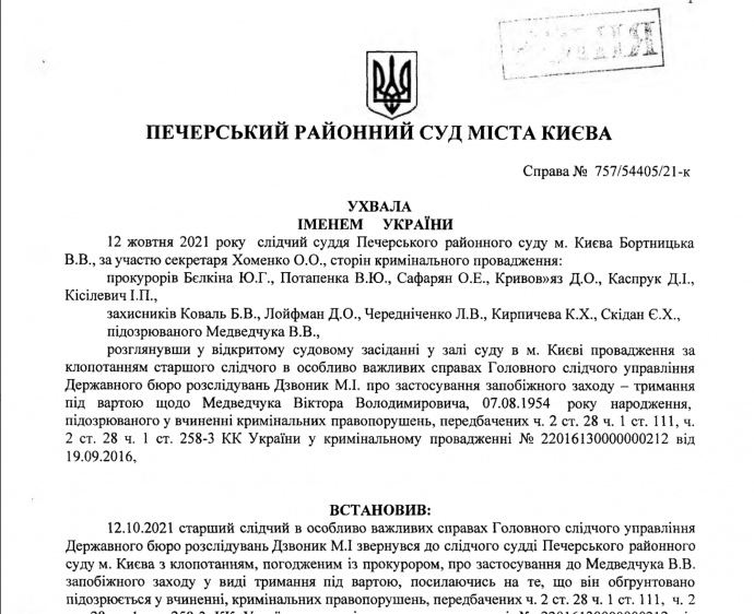 12 жовтня 2021 року суддя Печерського районного суду Києва Віта Бортницька, розглянувши клопотання ДБР та ОГП про застосування запобіжного заходу – тримання під вартою Віктора Медведчука ухвалила рішення "відмовити"