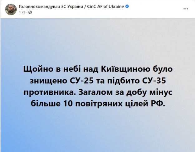 - Повітряні сили знищили два літаки Су-30СМ в Одеській області, вертоліт Ка-52 поблизу Миколаєва та літак Су-34 на Чернігівщині. Дані щодо втрат противника уточнюються.