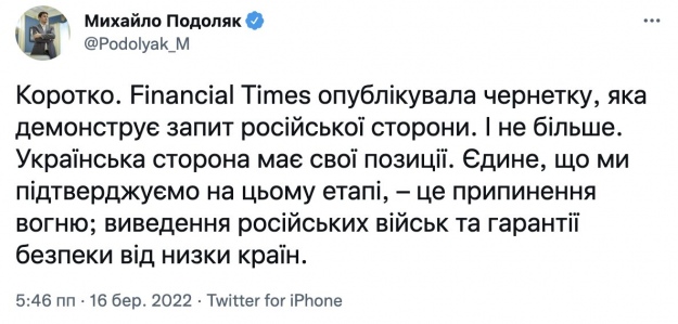 ❗В Офісі президента що опублікований раніше в Financial Times проєкт "мирної угоди" – лише запит російської сторони.