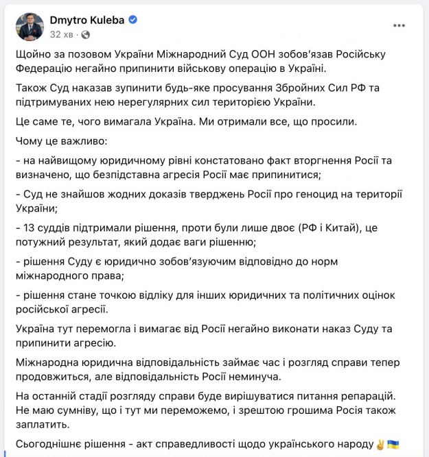 "Суд вважає, що Російська Федерація повинна гарантувати, що будь-які військові чи регулярні з’єднання, які можуть управлятися нею чи підтримуватися, а також будь-які організації чи особи, які можуть непрямо нею контролюватися, не вживатимуть подальших заходів у цих операціях".