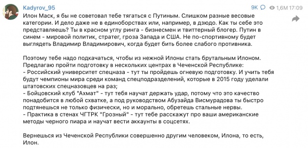 Спершу відомий порушник прав людини і спільник Путіна Рамзан Кадиров написав, що Маск – слабий суперник для російського президента, і запропонував пройти підготовку у центрах Чечні. А ще він назвав Ілона ніжною Ілоною.