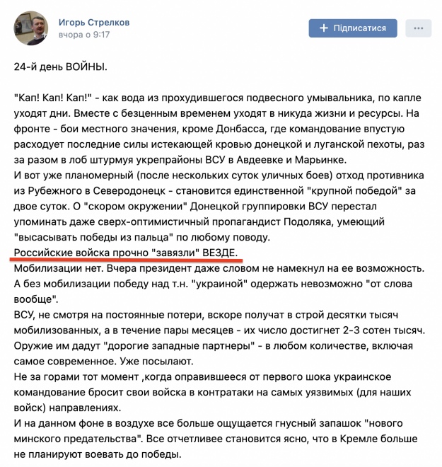 "Російські війська надійно "зав'язли" всюди", – скаржиться Гіркін на програші росіян на фронті та передбачає успіхи української армії. Той випадок, коли з ним важко не погодитись.