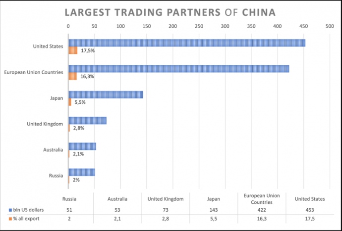 Експорт Китаю до ЄС, США, Великої Британії, Японії, Австралії та Канади, тобто до країн, які наклали на Росію найбільше санкцій, сукупно складає близько 50% усього китайського експорту на планеті. Тоді як експорт Китаю до РФ не перевищує 2%.