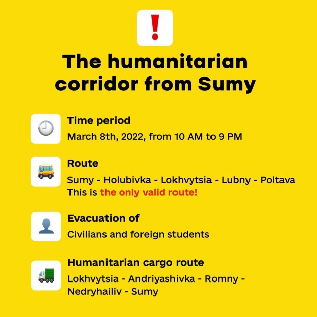 🚨 Російські окупанти вкотре оголошують "гуманітарний коридор" для евакуації населення українських міст, зокрема пропонують киянам 9 березня виїхати в Росію через Білорусь.