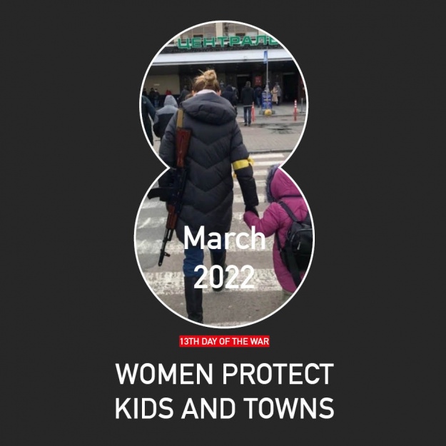 Поки фейсбук-героями цьогорічного восьмого березня ставали Зеленський, Кім та Арестович, у феміністичних пабліках поширють плакат з жінкою, яка несе за спиною зброю і тримає за руку дитину.