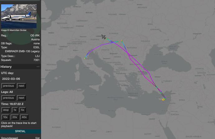 3 березня борт вилетів із Талліна до румунського міста Яссі, яке розташовується неподалік від українського кордону. Далі полетів до Відня, а з Відня – до Єгипта.