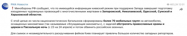 Кілька пропагандистських ЗМІ поширили публікацію щодо того, що "з націоналістів сформовано понад 70 мобільних груп на автомобілях, що обстрілюватимуть з мінометів православні храми у Великодню ніч, щоб потім звинуватити у цьому військових РФ".