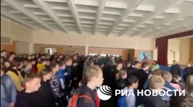 На відео діти нібито починають навчальний день під гімн РФ, сидять за партами та читають з дошки російською "Здравствуй школа".