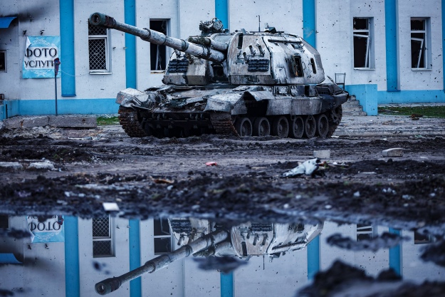 ... Посеред приватного сектору на околицях міста, яке чи не найбільше постраждало від російської навали, стоїть знищений танк із позначкою V, на якому хтось скотчем почепив аркуш A4 з оголошенням: "Речовий доказ. Не транспортувати".