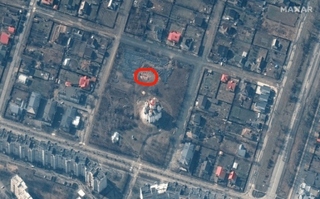 Американська компанія Maxar Technologies опубліковала знімки братської могили в Бучі, виритої на території церкви Андрія Первозванного.