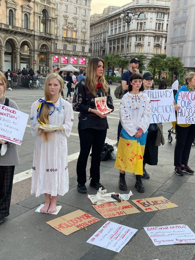 У центрі італійського Мілана українці провели мирну демонстацію з гаслом "Україна та Росія не є, не були, і ніколи не будуть "братськими народами", нагадавши зокрема про голодомор та звірства в Бучі.