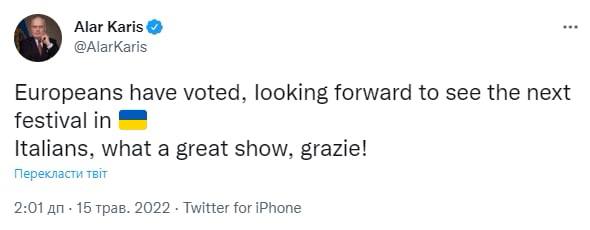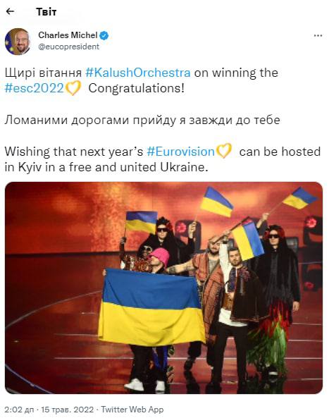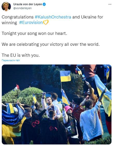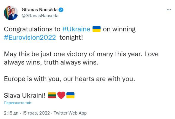 🇺🇦 "Нехай це буде лише одна перемога з багатьох цього року. Любов завжди перемагає, правда завжди перемагає. Європа з вами, наші серця з вами. Слава Україні!"— європейські політики та глави іноземних держав привітали Україну з перемогою на "Євробаченні-2022"