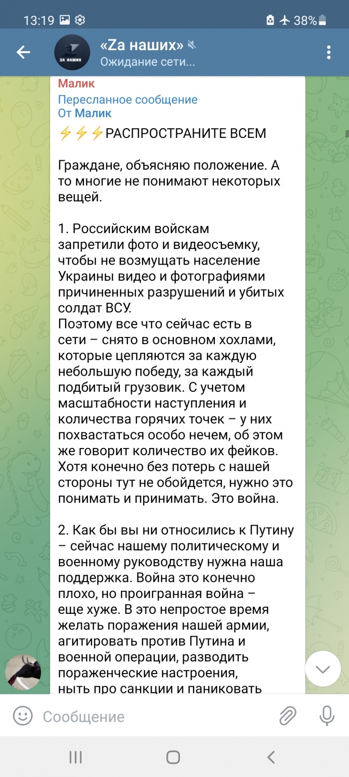 У чат періодично потрапляє так звана оперативна інформація, яка дезінформує учасників, що Харків захоплено, а у Києві чеченці проводять зачистки.