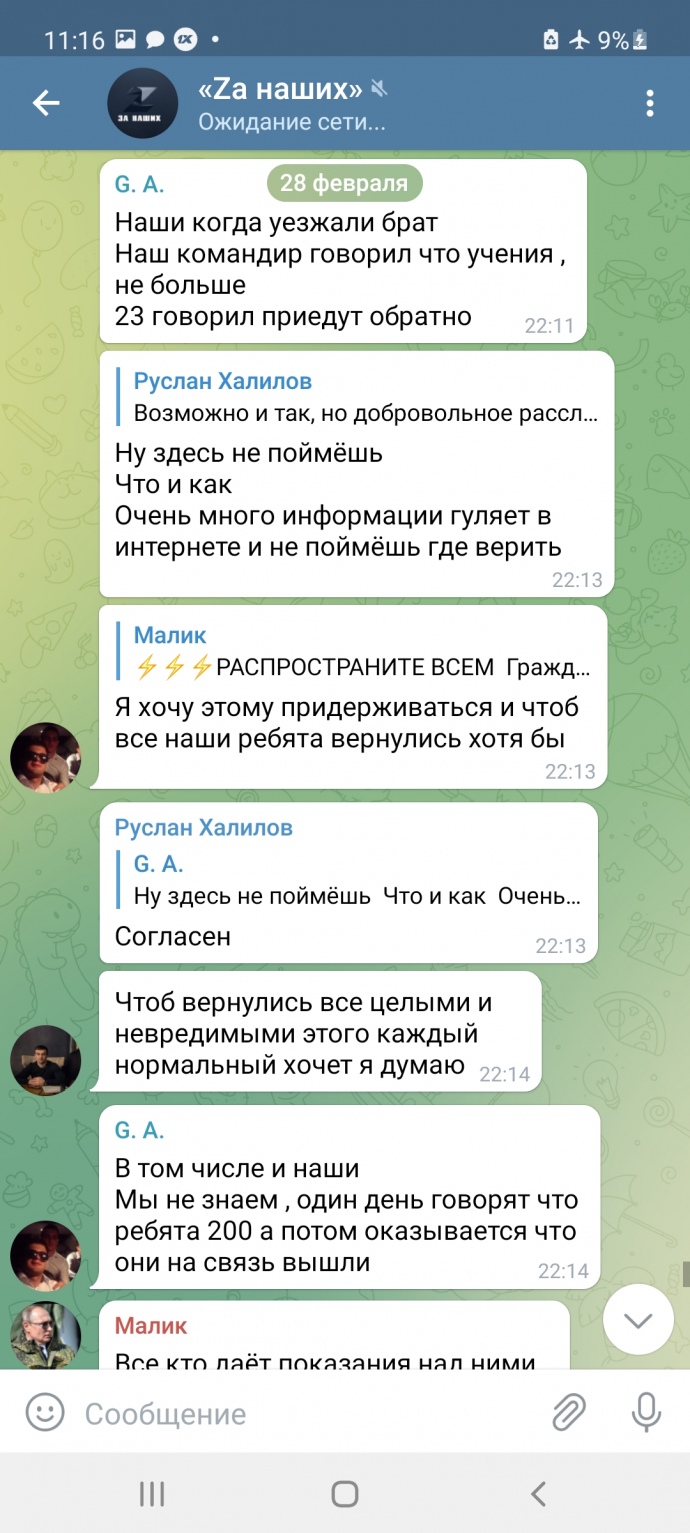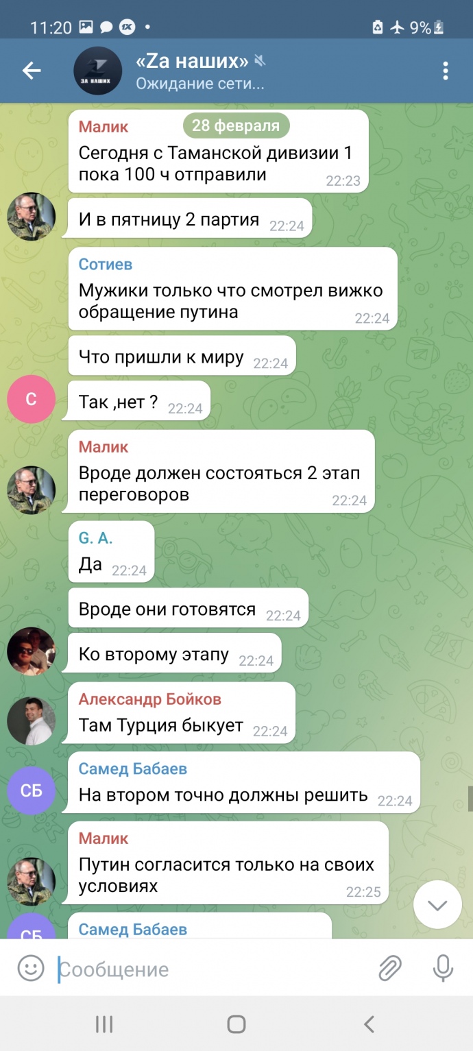 28-го лютого в чат пересилають повідомлення від службовця з ОМОНу, який відмовився їхати в Україну. Він повідомляє, що тих, хто відмовляється їхати, будуть звільняти з військової служби.