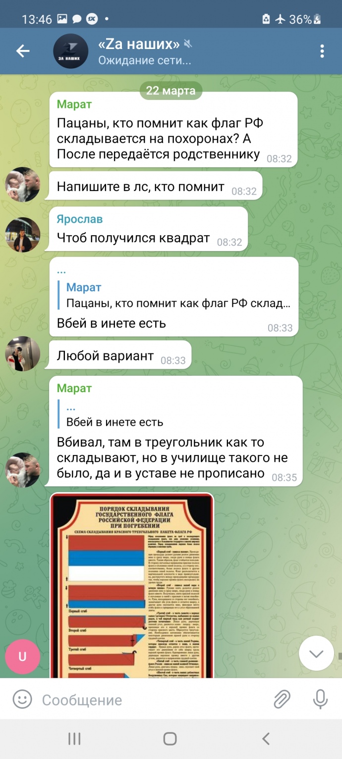 Наприкінці березня у чаті виникає дискусія з приводу того, як правильно складати російський прапор на похороні військовослужбовців. Думки серед учасників розділились між двох варіантів: у формі квадрата чи у формі трикутника.