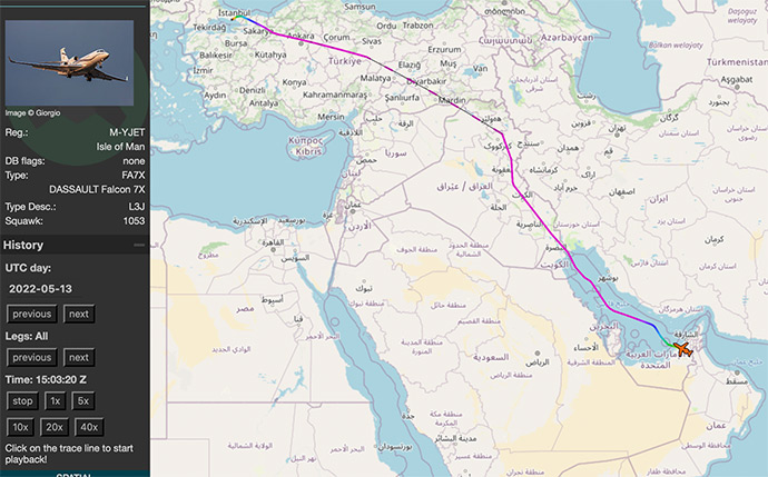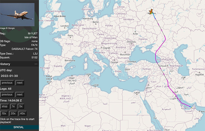 Натомість борт постійно курсує між країнами, які наразі не засостосували жодних санкцій та обмежень відносно олігархів, наближених до президента Росії Володимира Путіна.