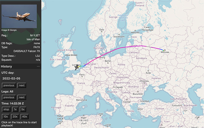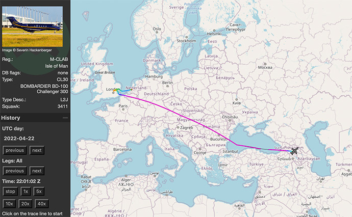 Якщо за допомогою відкритих даних онлайн-радарів простежити за літаком Ярославського, то можна помітити цікаву обставину – за час повномасштабної війни його Bombardier Challenger 300 постійно курсує між Лондоном та голландським Роттердамом і двічі літав до Тбілісі (Грузія).