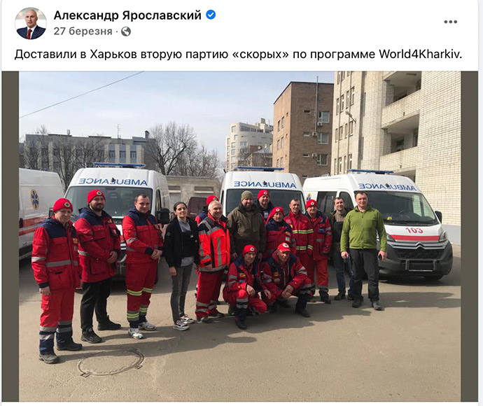 Ярославський пообіцяв зібрати з друзями мільярд доларів не так для захисту, як на відновлення Харкова. Натомість наразі відомо про дві партії "швидких" для міста за ініціативою його фонду, близько тридцяти автівок.