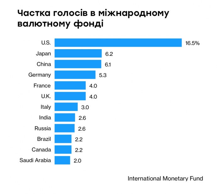 Проте сила голосу кожної країни при ухваленні рішень є різною і залежить від суми грошей, внесених до МВФ. США мають найбільше голосів – 16.5%, далі йдуть Японія і Китай, які мають по 6% голосів, Німеччина 5%, по 4% Франція і Британія, так далі до нуля. Тобто, саме багаті країни вирішують, кого і на яких політичних умовах рятувати із економічної скрути.