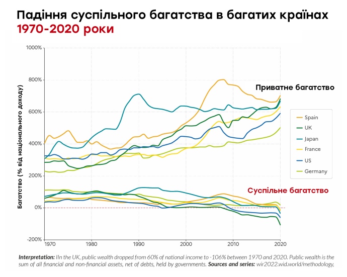Для прикладу у Британії публічне багатство (державне та місцевого самоврядування) складало 60% від національного доходу в 70-х, а у 2020 році воно стало відʼємним (-106%).