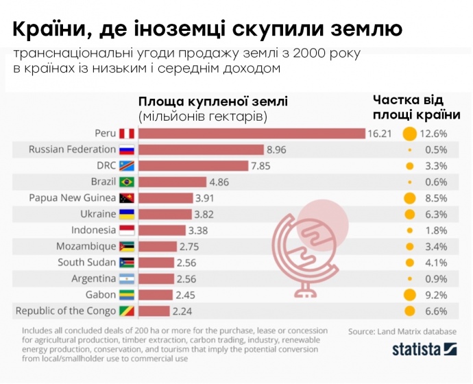 Сама ж Україна знаходиться у топ-6 країн, що розвиваються, землі яких були скуплені шляхом транскордонних угод із 2000 року – це більше 6% загальної площі країни. Деякі країни втратили вже більше 10% своїх територій.