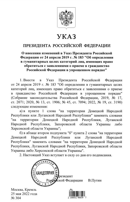 ⚡Президент Росії підписав указ про спрощене отримання громадянства Росії для мешканців окупованих територій Херсонської та Запорізької областей України.