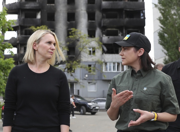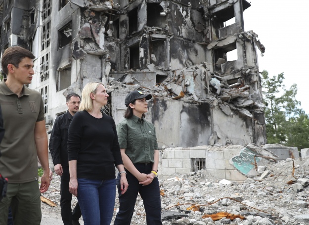 Нова посол США в Україні Бріджит Брінк у Бородянці, понівеченій російськими окупантами.