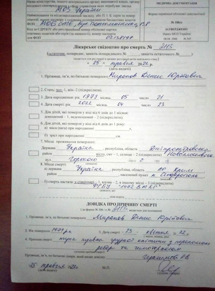 У свідоцтві про смерть Дениса зазначено: причина смерті – тупа травма грудної клітини з переломом ребер.
