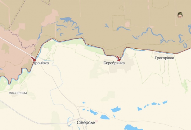 На карті можна побачити, наскільки близько Серебрянка та Григорівка розташовані до лінії розмежування.
