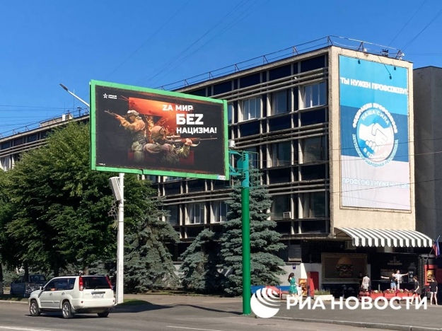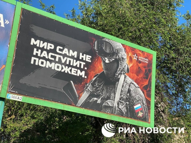 "Мир сам не наступит. Поможем", "Мы русские! С нами Бог", "Za мир беz нацизма!".