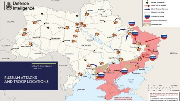 Росія взяла під свій контроль більшу частину Сєвєродонецька. Основна дорога, яка веде до сєвєродонецького "котла", ймовірно, залишається під контролем України, зазначили у розвідці.