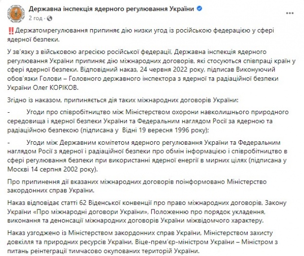 ⚡☢Державна інспекція ядерного регулювання України припиняє угоди з Росією у сфері ядерної безпеки