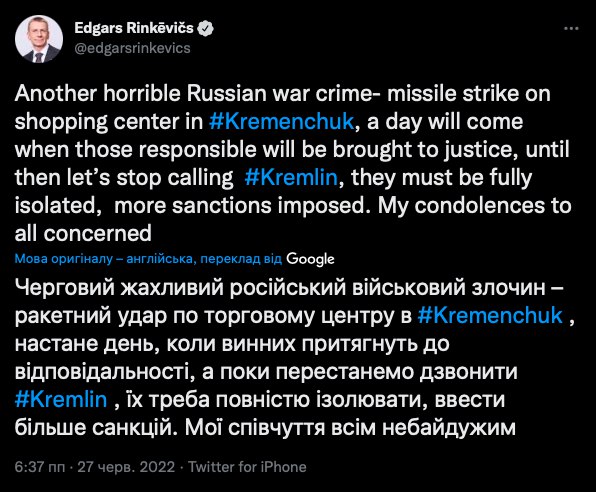 🇱🇻 "Перестаньмо дзвонити у Кремль": глава МЗС Латвії Едгарс Рінкевичс заявив, що після ракетних обстрілів ТРЦ в Кременчуці потрібно накласти ще більше санкцій проти Росії