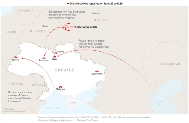 "New York Times" показав, звідки Росія била ракетами по Україні 25-26 червня.