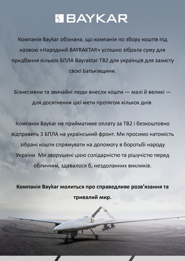 Виробник безпілотників "Байрактар" зворушений солідарністю українців щодо збору коштів через благодійний фонд Сергія Притули, тому передасть безпілотники безкоштовно