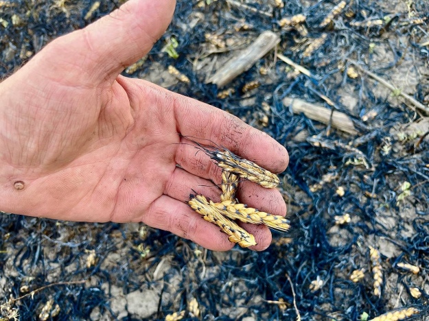 Аграрій Сергій показує журналістці УП колоски ячменю на своєму вщент спаленому полі на Миколаївщині – біля нього прилетів російський касетний боєприпас.