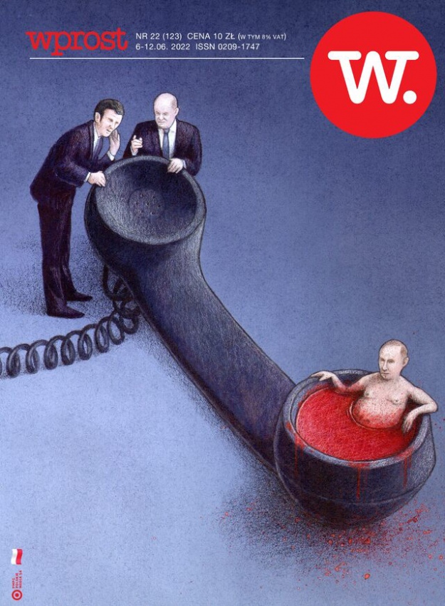 Політичний журналіст Томас О. Фолк: "Польський журнал Wprost вибрав надзвичайно підходящу обкладинку для свого червневого номера, враховуючи небажання Макрона "принижувати Росію" і бентежну відсутність підтримки Шольца загалом".