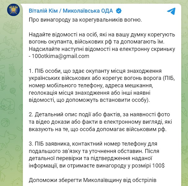 Інструкція від голови Миколаївської ОВА Віталія Кіма, як здавати корегувальників вогню