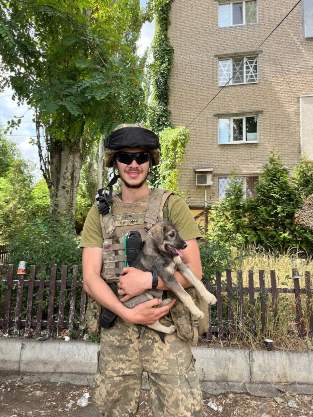 На фото бойовий медик з Печерської ТРО Богдан із своїм щеням на кличку Воллі. Воллі – це скорочено "війна Україна".