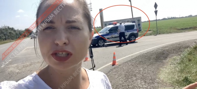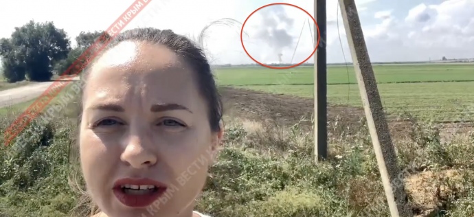Кореспондентка каже, що знаходиться на перехресті між селами Майське та Азовське. За спиною журналістки можна побачити характерну стелу. На задньому плані – вибухи.