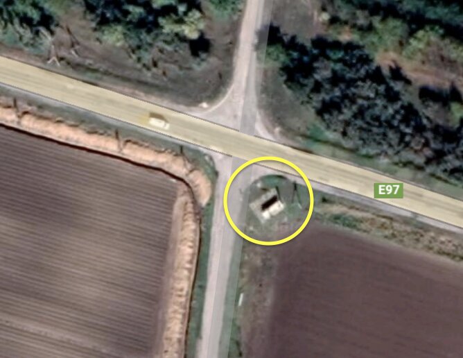 Схоже перехрестя зі стелою є на супутникових знімках. Напрямок від нього до колишньої свиноферми відповідає напрямку вибухів на відео.