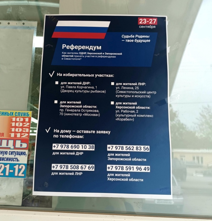 Вулицями також розвішені інструкції для переселенців із нещодавно окупованих Росією українських регіонів щодо можливості проголосувати на "референдумі", який проводили наприкінці вересня.