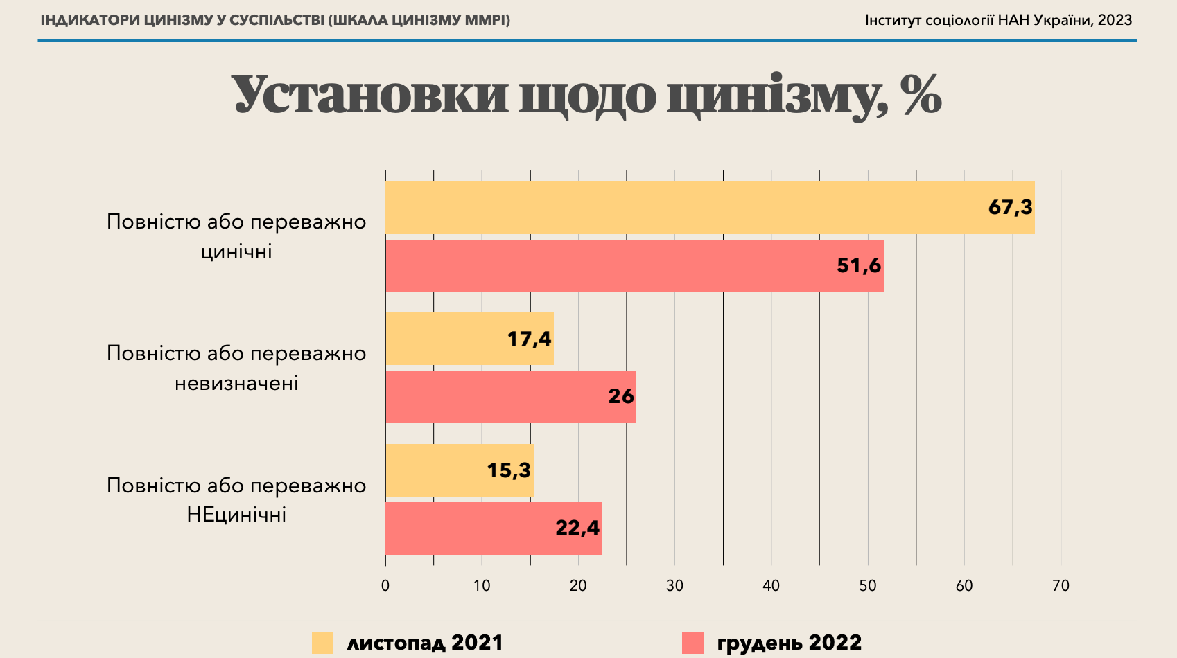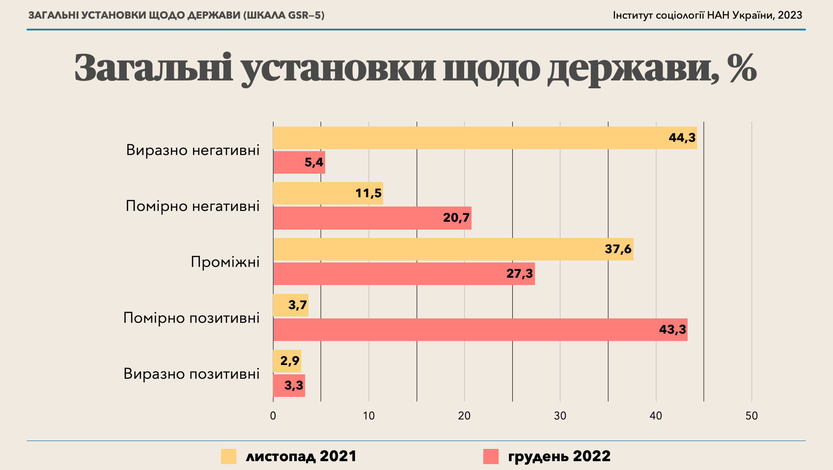 Ми в травні 2022 року провели опитування за індексом загальних установ про ставлення до держави – від виразно негативного до виразно позитивного. Якщо порівнювати 21-й з 22-м, то все чудово, значно покращилось ставлення до держави.