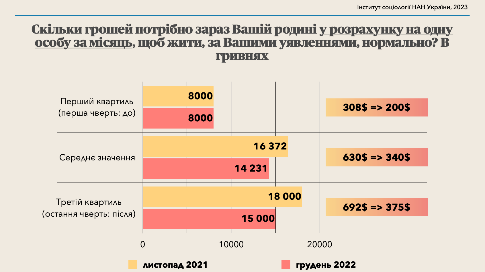 Якщо в 2021 році люди казали, що для нормального життя їм в середньому потрібно 16,4 тисячі гривень на місяць на одну людину, то зараз – 14,2.