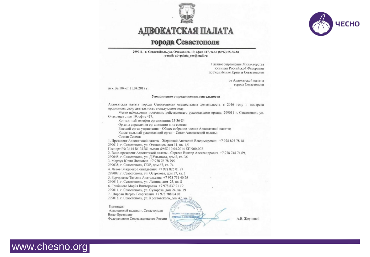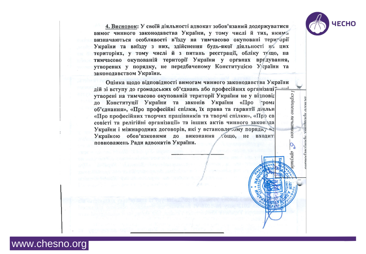Водночас у тимчасово окупованому Криму частина адвокатів набули громадянство країни-окупанта, склали присягу адвоката РФ та очолили органи російської адвокатури.
