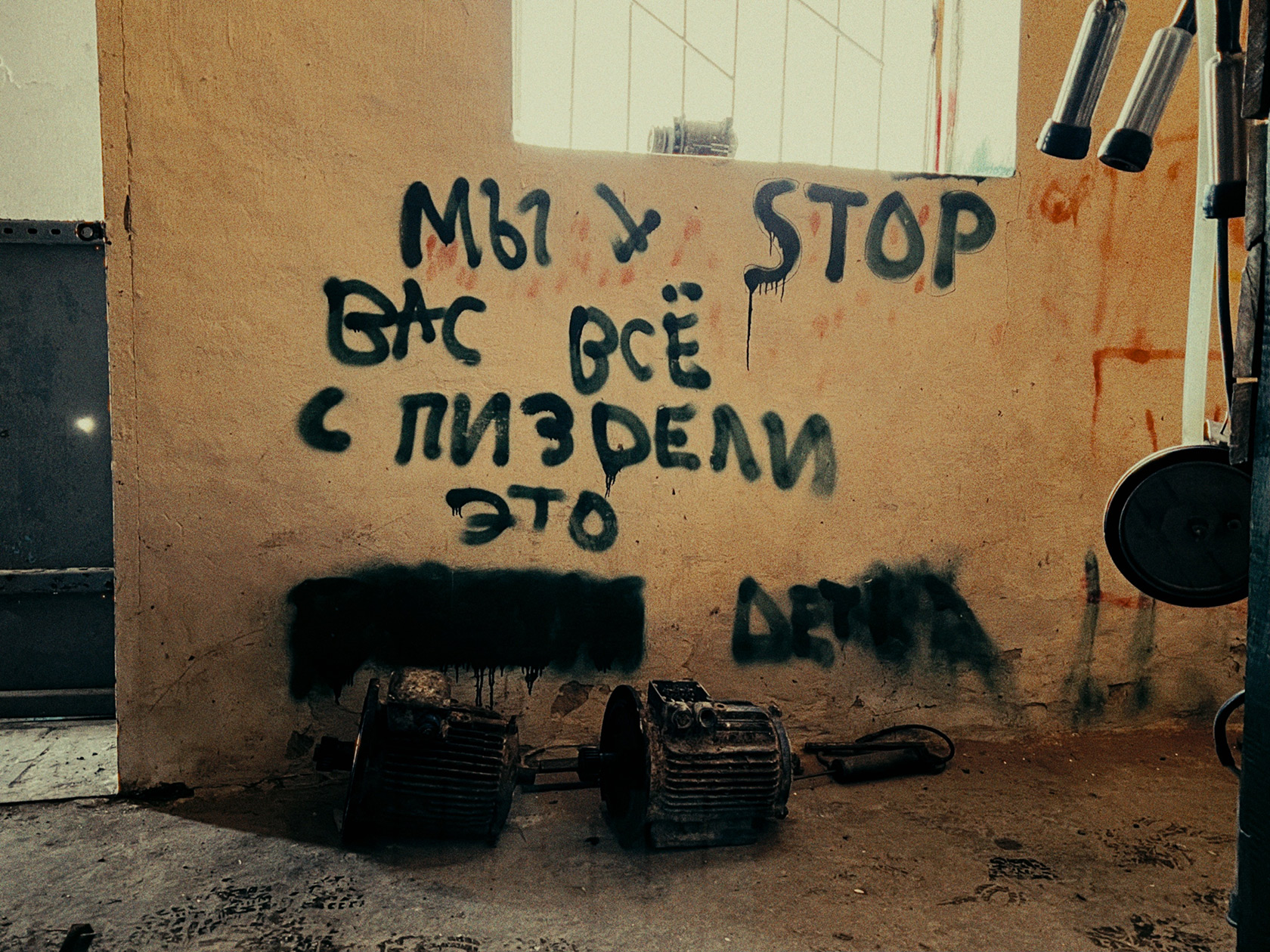 Під ногами хрустить сніг. Сергій заводить нас до комори, де також господарювали росіяни. На стіні вони залишили графіті – чорта з Z. А ще – послання, явку з повинною (орфографія збережена): "Мы у вас все с пиздели" та підпис "Это Россия детка". Зрештою чомусь вирішили замісти сліди та замалювали підпис. Проте зробили це вкрай невдало.