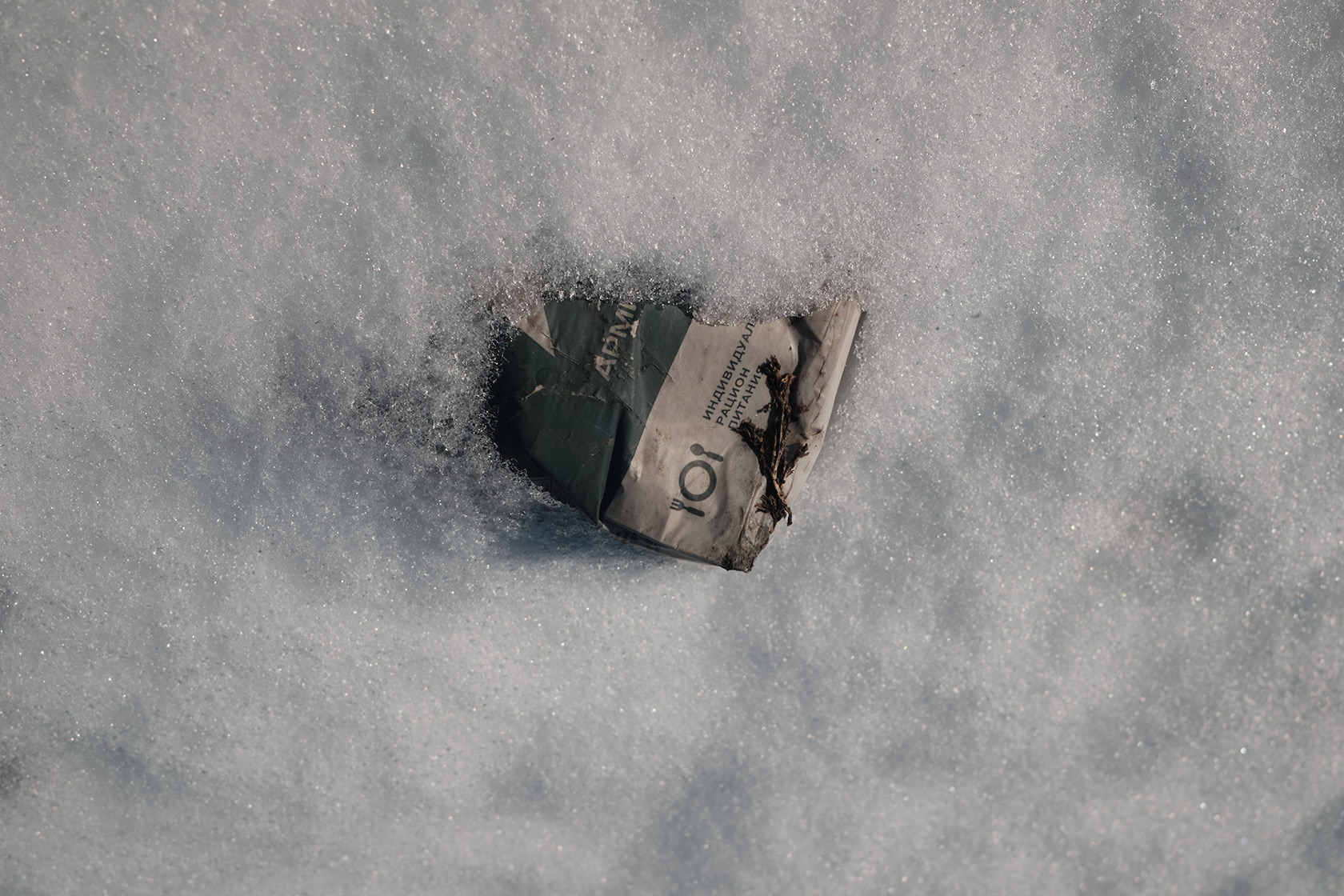 Із землі стирчить ракета, неподалік від неї – упаковка від сухпаю армії РФ.