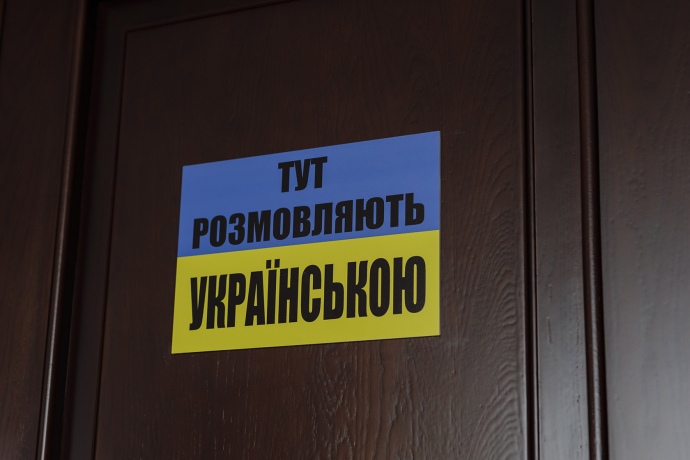 На дверях його робочого кабінету висить наліпка "Тут розмовляють українською".