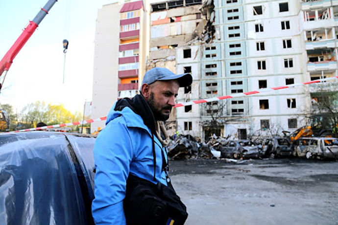 Олексій показує мені свою напіврозбиту автівку, яку придбав тиждень тому. Каже, що мешкає на першому поверсі, прокинувся завчасно, під час тривоги, та встиг врятувати себе і дружину.